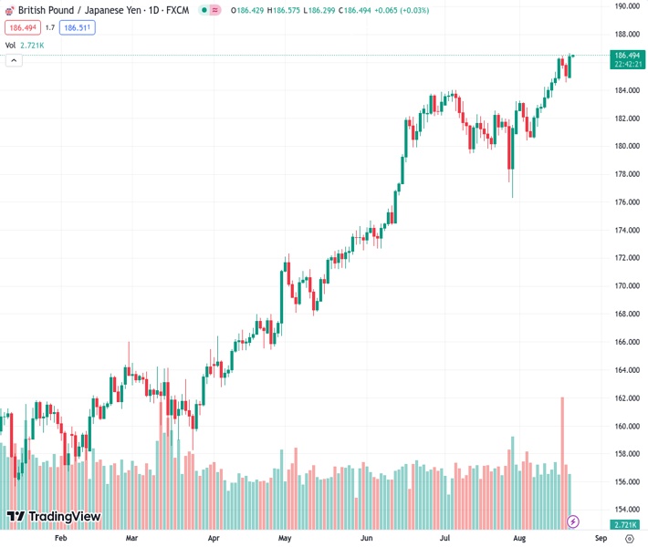 GBPJPY currently trading at 186.52 at the time of writing. Pair opened at 185.12 and is trading with a change of 0.76 % .