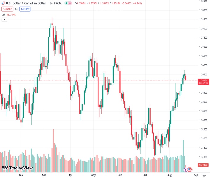 The US Dollar to Canadian Dollar exchange rate, currently at 1.35185, is experiencing a correction and is moving closer to 1.3520. This adjustment is due to the US Dollar losing momentum after a period of strong performance.