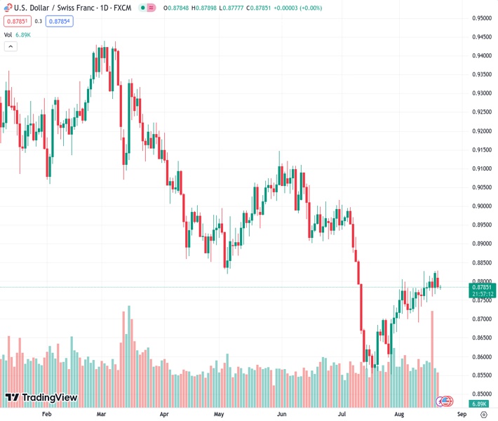 The USDCHF pair, currently at 0.87851, experiences a slight decline near 0.8755 and is up by 0.01% for the day.