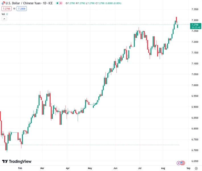 The USDCNY rate is currently 7.30008, while the People’s Bank of China (PBOC) has set the reference rate at 7.1987, compared to the previous rate of 7.2006.