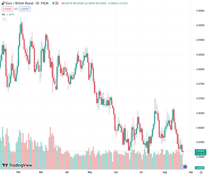 For the past five days, the EUR to GBP currency pair has been trading at a level of 0.85200, fluctuating between 0.8500 and 0.8550. It temporarily reached its lowest level of the year at 0.8504.
