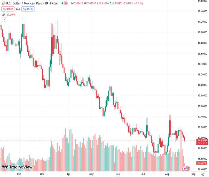 Societe Generale believes that in order to confirm a sustained recovery, it is crucial for the US dollar to surpass the 17.42 peso level, as the current exchange rate stands at 16.9502 US dollars to the Mexican peso.