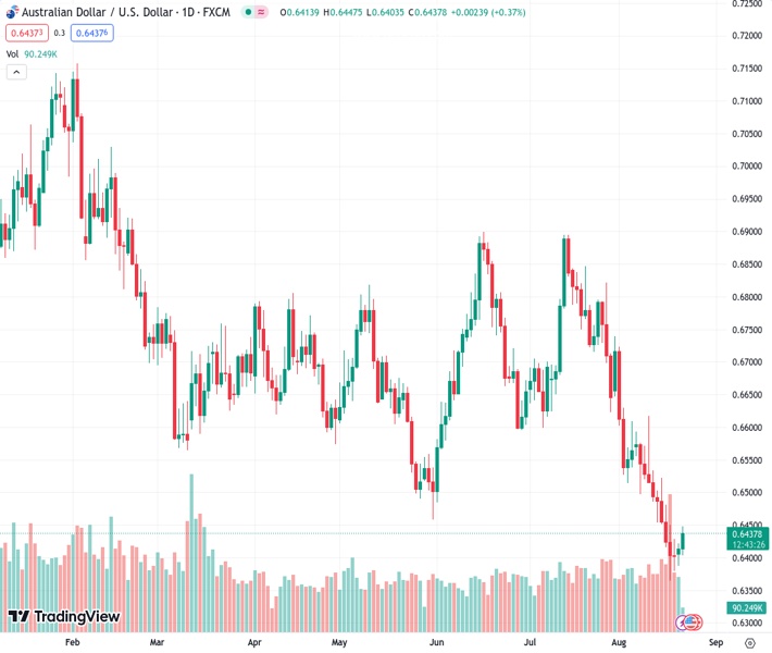 The AUD/USD currency pair at a rate of 0.64403 experiences further positive momentum and rises to its highest point in multiple days on Tuesday.