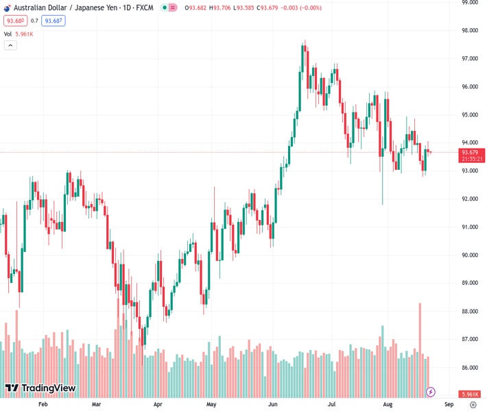 AUDJPY currently trading at 93.69 at the time of writing. Pair opened at 93.79 and is trading with a change of -0.11 % .