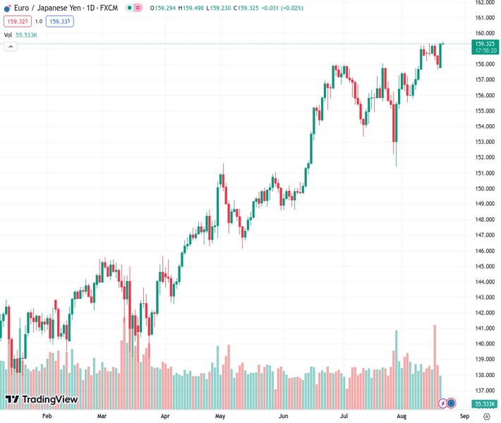 EURJPY currently trading at 159.3 at the time of writing. Pair opened at 159.32 and is trading with a change of -0.01 % .