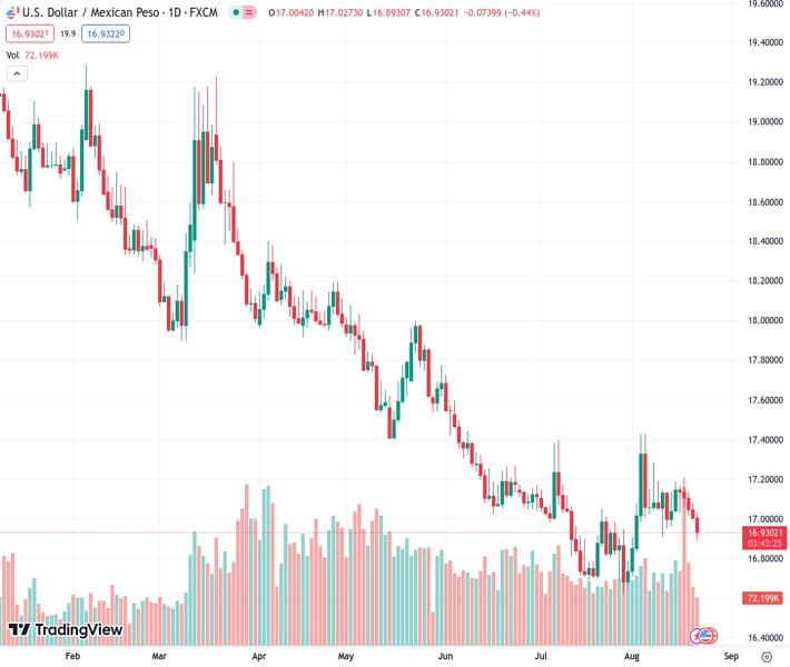 USDMXN currently trading at 16.9317 at the time of writing. Pair opened at 17.015 and is trading with a change of -0.49 % .