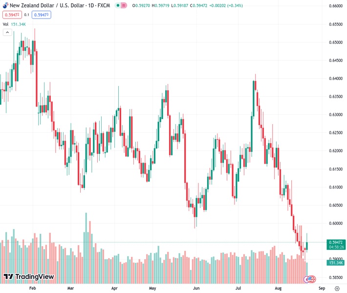 The New Zealand dollar to US dollar exchange rate is at 0.59459. Existing Home Sales in the US experienced a decline of 2.2% in July, attributed to limited availability of homes for sale and an increase in mortgage rates.