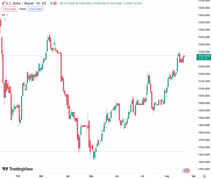 The USD to IDR exchange rate remains at around 15,325, showing a positive trend due to the increase in US Treasury bond yields and the strengthening of the USD.
