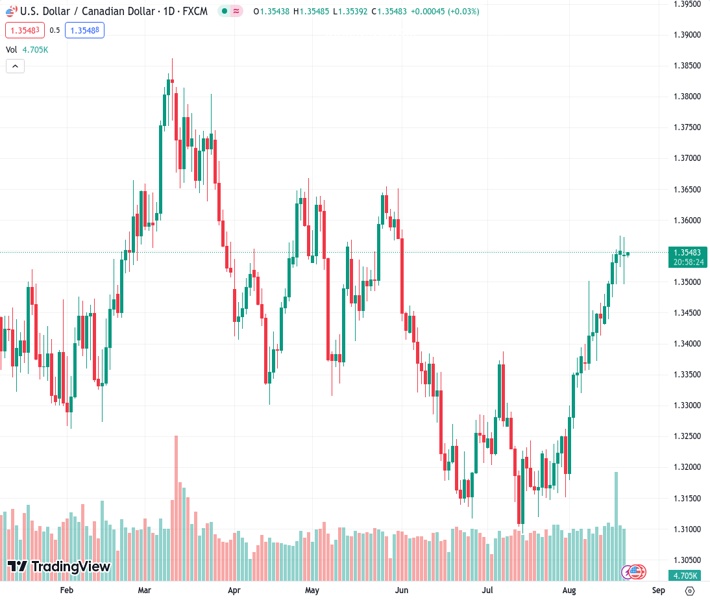 USDCAD currently trading at 1.3543 at the time of writing. Pair opened at 1.3552 and is trading with a change of -0.07 % .