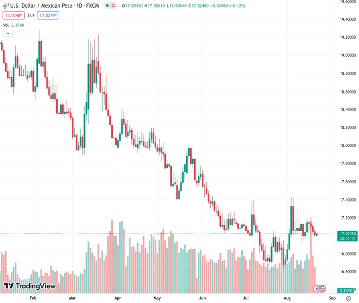 USDMXN currently trading at 17.0228 at the time of writing. Pair opened at 17.057 and is trading with a change of -0.20% % .
