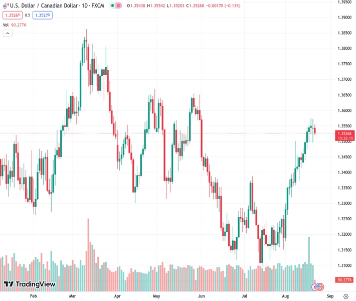 USDCAD currently trading at 1.3525 at the time of writing. Pair opened at 1.3545 and is trading with a change of -0.15 % .