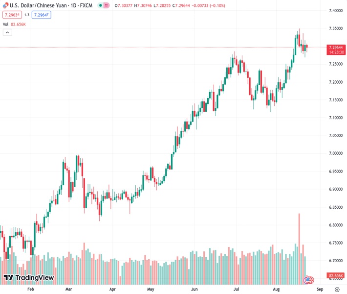 Danske Bank predicts that the exchange rate for USDCNH, currently at 7.29535, will rise to 7.60 within a year.