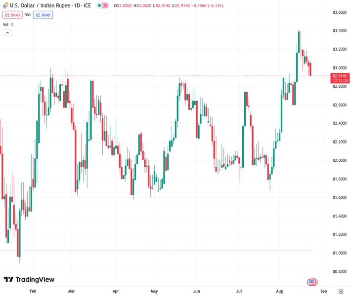 USDINR currently trading at 83.0225 at the time of writing. Pair opened at 83.0935 and is trading with a change of -0.09 % .