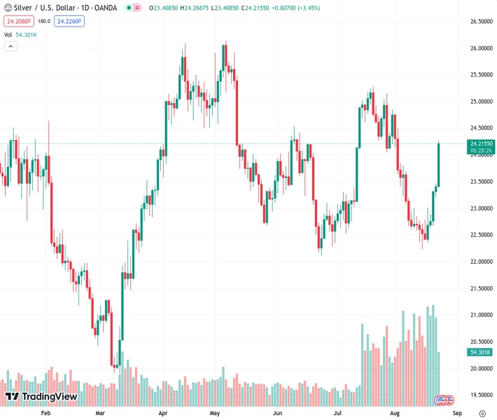 Silver price rises above $24.00 following the release of disappointing preliminary PMI data for August by S&P Global.