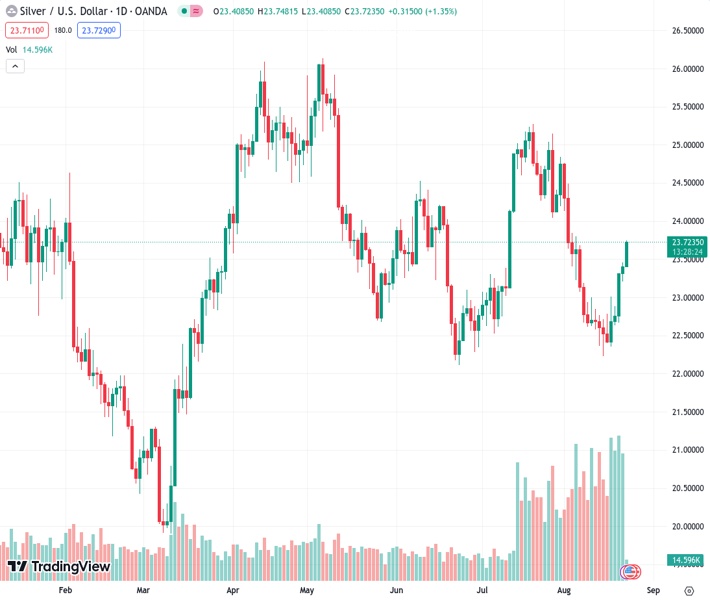 XAGUSD currently trading at 23.69 at the time of writing. Pair opened at 23.41 and is trading with a change of 1.2 % .