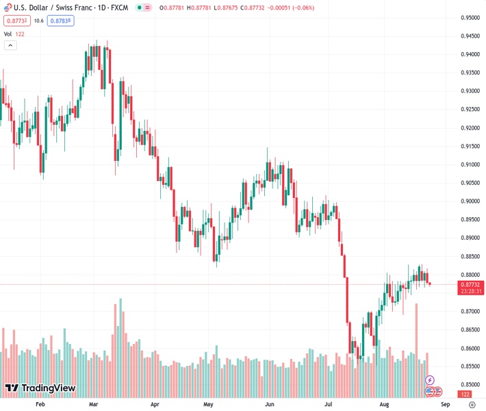 The currency pair USD/CHF has been trading within a narrow range of 0.8765 to 0.8830 for the past eight days and is currently positioned close to the middle point of the 0.8700 to 0.8800 range.