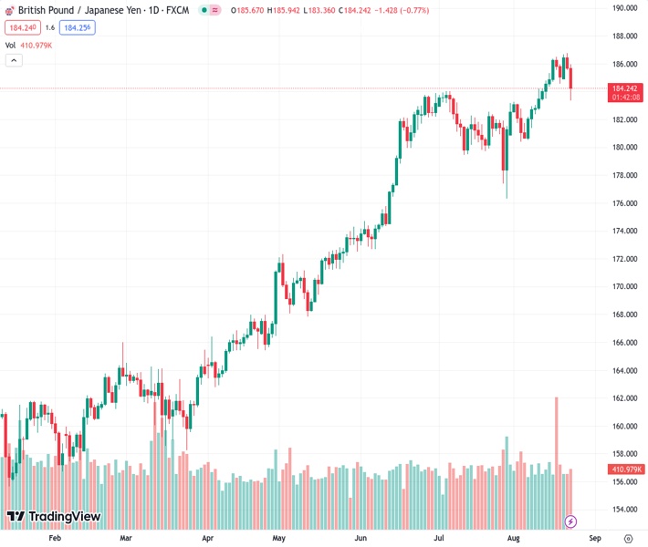 GBPJPY currently trading at 184.24 at the time of writing. Pair opened at 185.75 and is trading with a change of -0.81 % .