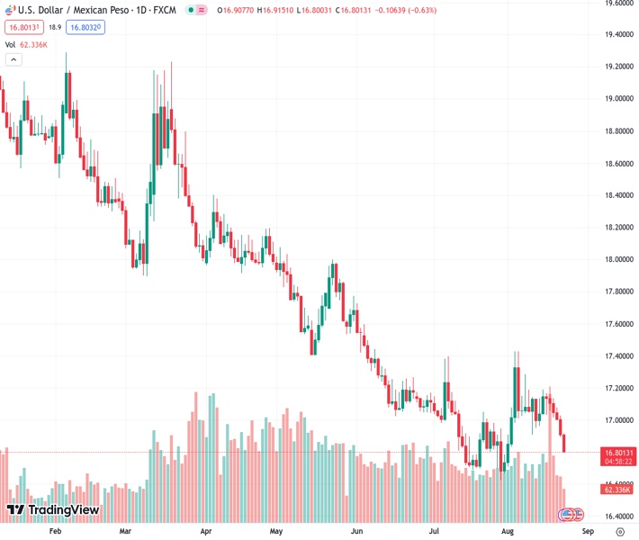 USDMXN currently trading at 16.8134 at the time of writing. Pair opened at 16.9114 and is trading with a change of -0.58 % .