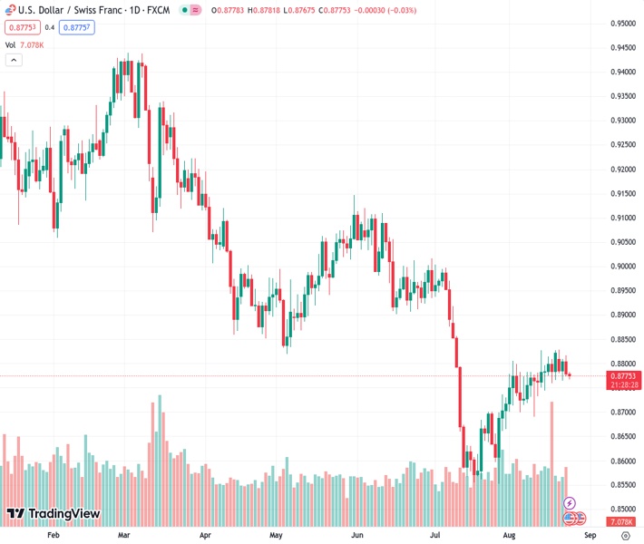 The USD/CHF pair loses traction and edges lower to 0.8775 during the early Asian session on Thursday. Meanwhile, the US Dollar Index (DXY), a measure of the value of USD against six other major currencies, drops to 103.35 after retreating from a two-month high of 103.98. Markets turn cautious ahead of the release of US economic data and the Jackson Hole Symposium on Thursday.