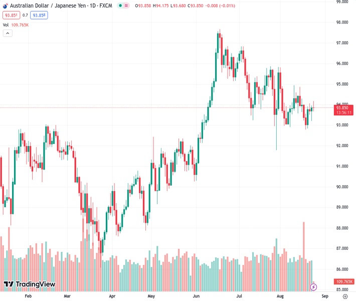 AUDJPY currently trading at 93.92 at the time of writing. Pair opened at 93.88 and is trading with a change of 0.04 % .