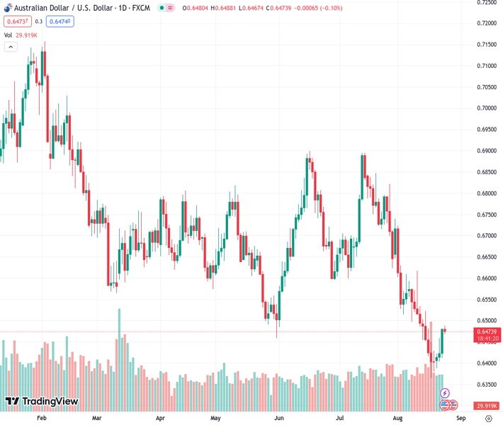 The AUD/USD pair struggles to capitalize on its weekly gains and retreats a few pips from a one-and-half-week high touched during the Asian session on Thursday. Spot prices currently trade around the 0.6475 region, down less than 0.10% for the day, as traders now look to the crucial Jackson Hole Symposium before placing fresh directional bets.