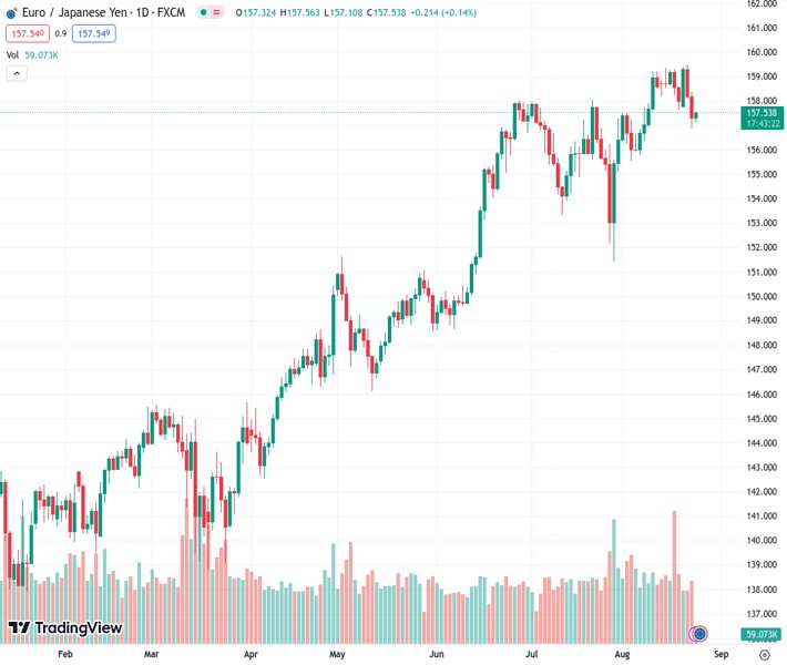 EURJPY currently trading at 157.54 at the time of writing. Pair opened at 157.32 and is trading with a change of 0.14 % .