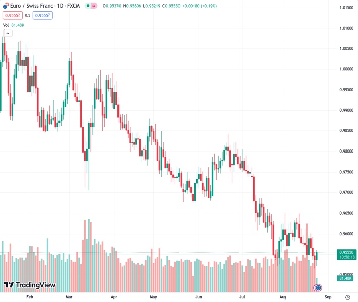 The Euro-Swiss Franc pair, currently at a rate of 0.95553, may have the potential to reach the lowest level seen last year at 0.94 if it fails to maintain support at 0.9515, according to financial institution Societe Generale.