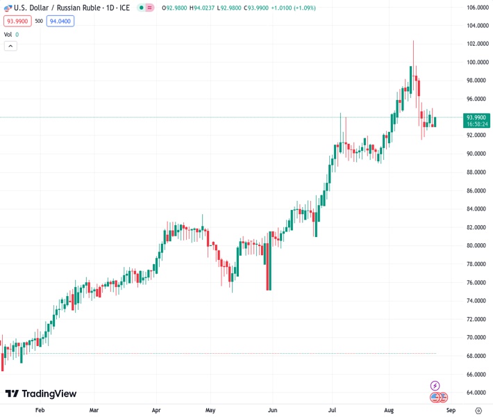 The US dollar to Russian ruble exchange rate at 93.9955 shows increasing strength approaching the 94.00 level due to the prevailing cautious sentiment in the market.