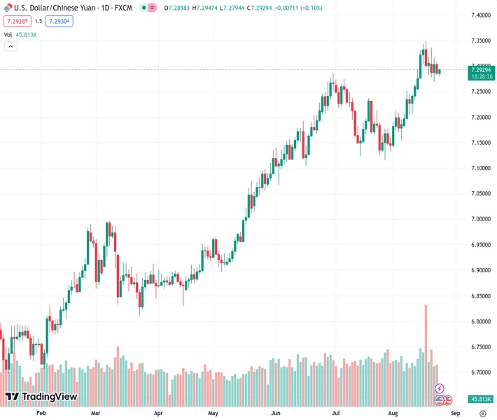 USD/CNH reverses the previous day’s losses while refreshing the intraday high around 7.2915 amid early Thursday. In doing so, the offshore Chinese Yuan (CNH) pair prods the support-turned-resistance line from late July amid market’s consolidation ahead of the top-tier US data and Jackson Hold speeches.