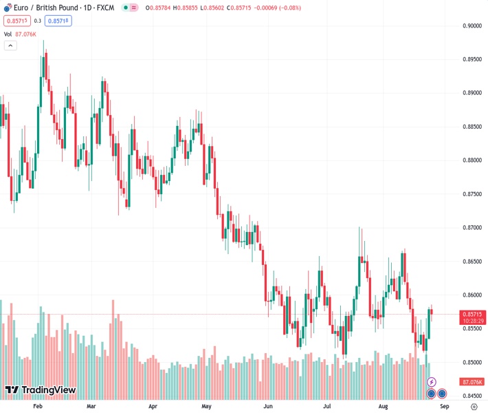 Danske Bank predicts that the EURGBP exchange rate, currently at 0.85716, will increase and reach a range of 0.87-0.88 within the next year.