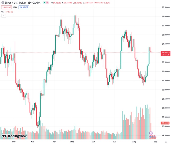 XAGUSD currently trading at 24.31 at the time of writing. Pair opened at 24.12 and is trading with a change of 0.79 % .