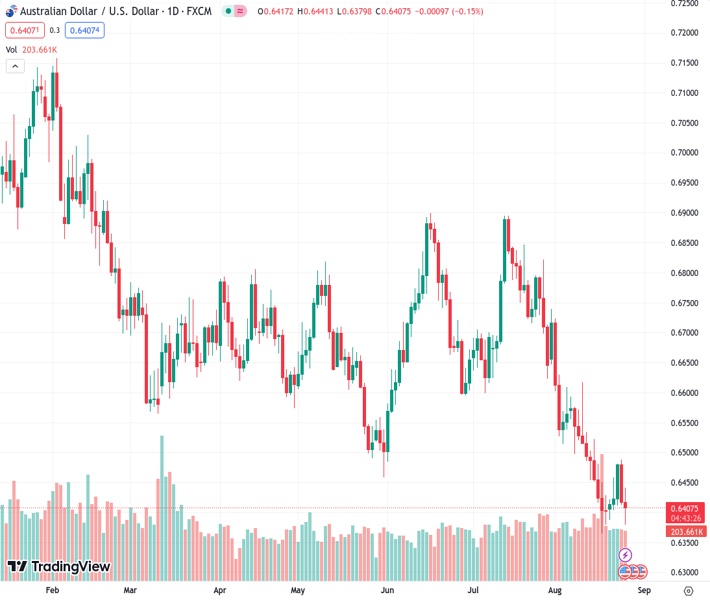 The AUDUSD currency pair dropped by over 0.50% and reached a daily low around 0.6380.