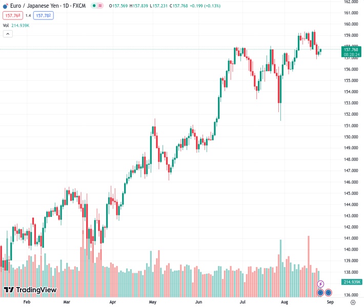 EURJPY currently trading at 157.74 at the time of writing. Pair opened at 157.67 and is trading with a change of 0.04 % .