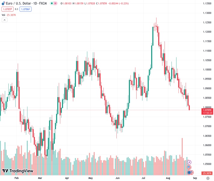 The EURUSD currency pair, currently trading at 1.07857, has reached its lowest point in the past two months and appears likely to record losses for the sixth consecutive week.