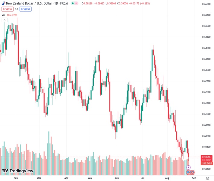 The NZDUSD currency pair declined to its lowest level since November 2022, dropping below 0.5900, before later recovering and settling above that level.