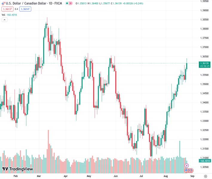 USDCAD currently trading at 1.3612 at the time of writing. Pair opened at 1.3582 and is trading with a change of 0.22 % .