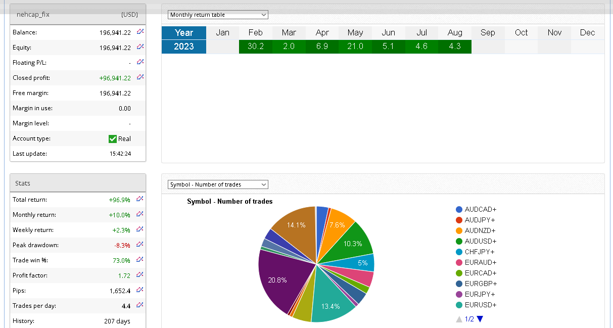 The August returns has risen to 4.3%. Overall returns now stand at +96.9%. The live account has risen from $100k to 196.9k.