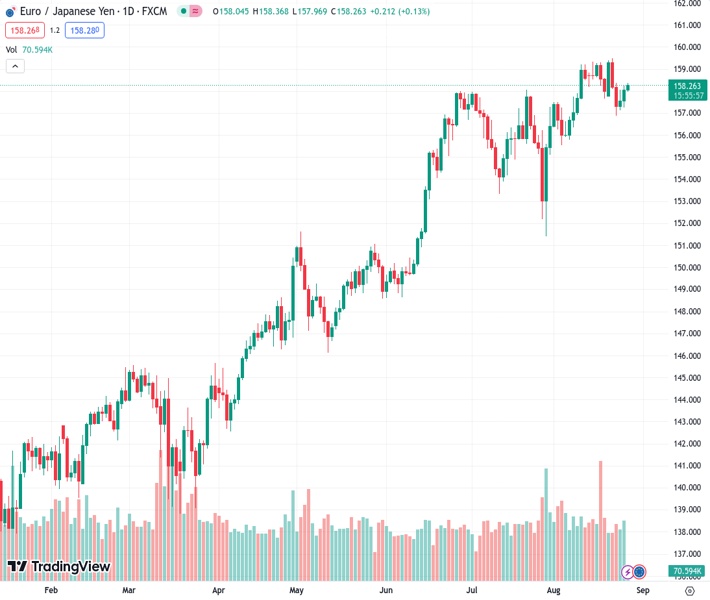 EURJPY currently trading at 158.35 at the time of writing. Pair opened at 158.1 and is trading with a change of 0.16 % .