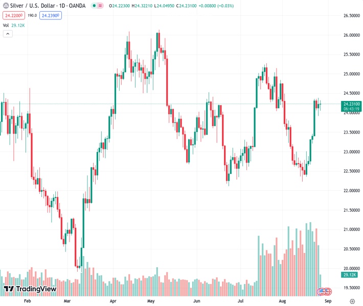 XAGUSD currently trading at 24.26 at the time of writing. Pair opened at 24.24 and is trading with a change of 0.08 % .