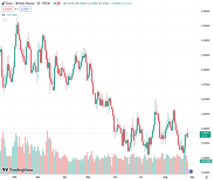 The EURGBP currency pair, currently trading at 0.85852, is now at 0.8585, and it is currently testing the 50-day Moving Average at 0.8583. If it closes above this level, it could potentially aim for the 0.8600 mark.