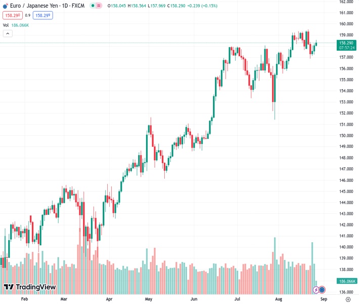EURJPY currently trading at 158.28 at the time of writing. Pair opened at 158.1 and is trading with a change of 0.11 % .