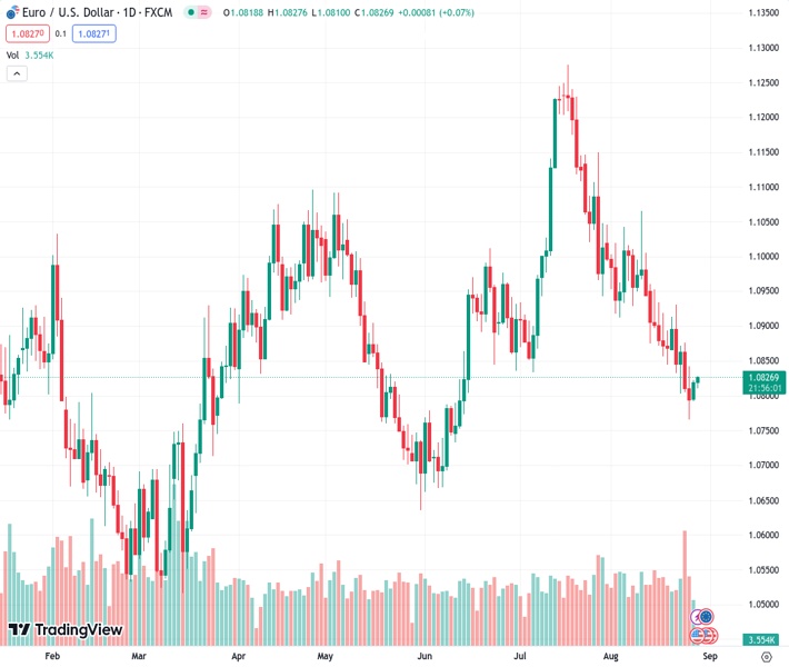 The EURUSD pair, currently trading at 1.08268, has slightly increased in value following a decline over the past two days. This uptick comes after reaching its lowest point in 11 weeks.