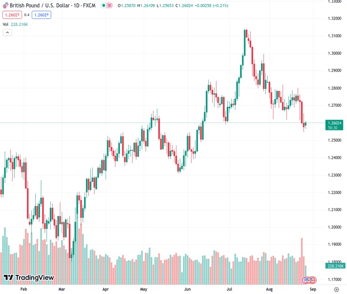 - GBP/USD trades at 1.2601, up 0.19%, as a UK Summer Bank Holiday and falling US bond yields offer temporary relief to the beleaguered Pound.