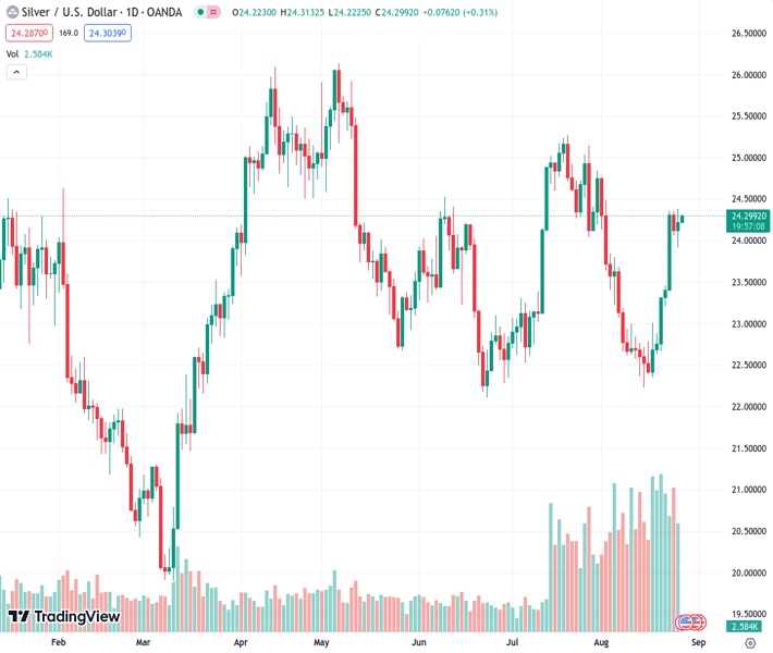 The silver price at $24.300 is experiencing small increases after recording the largest weekly gain in six weeks. The outlook from @nehcap indicates anticipation for more upward movement.