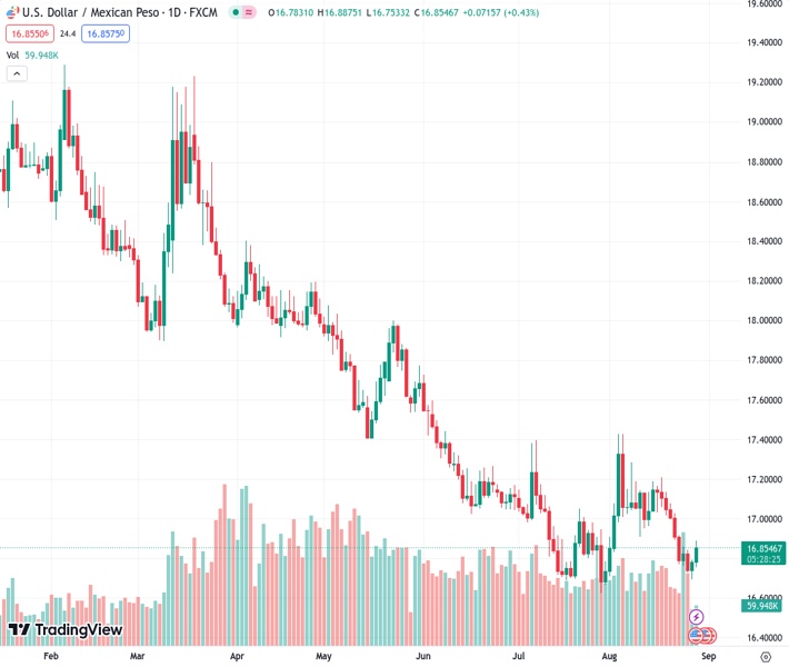 USDMXN currently trading at 16.8542 at the time of writing. Pair opened at 16.7898 and is trading with a change of 0.38 % .