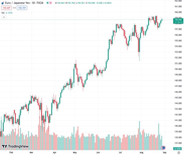 EURJPY currently trading at 158.69 at the time of writing. Pair opened at 158.53 and is trading with a change of 0.1 % .