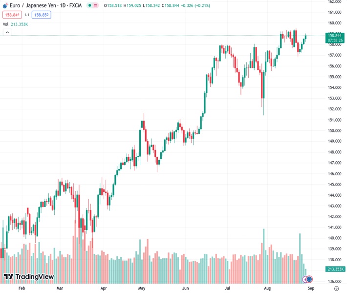EURJPY currently trading at 158.93 at the time of writing. Pair opened at 158.53 and is trading with a change of 0.25 % .