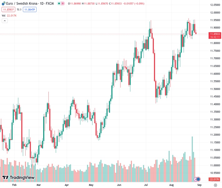 EURSEK currently trading at 11.8609 at the time of writing. Pair opened at 11.8837 and is trading with a change of -0.19 % .