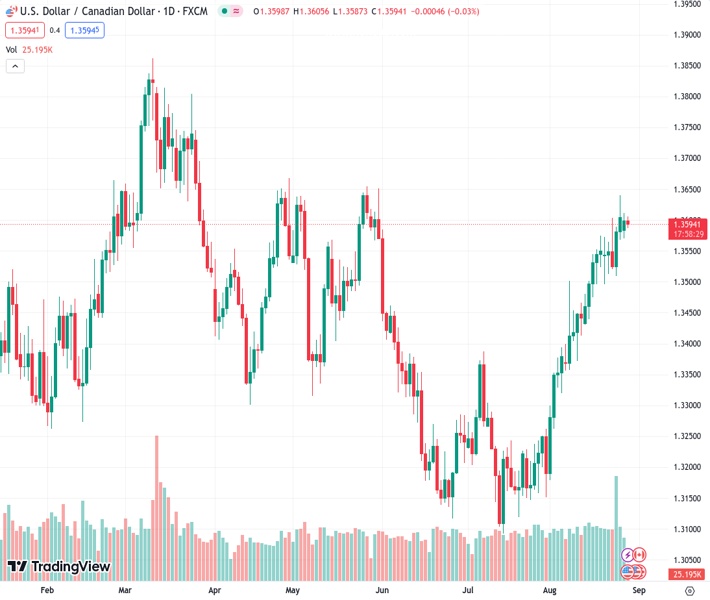 USDCAD currently trading at 1.3596 at the time of writing. Pair opened at 1.36 and is trading with a change of -0.03% % .