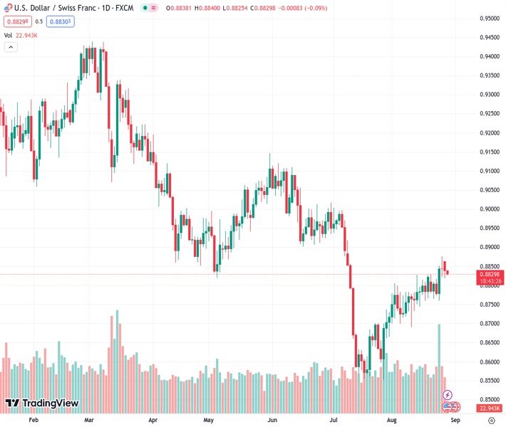 USDCHF currently trading at 0.8828 at the time of writing. Pair opened at 0.8839 and is trading with a change of -0.12% % .